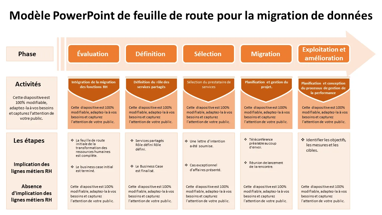 Un modèle Powerpoint de feuille de route de migration de données conçu par des professionnels pour visualiser les étapes du projet, les objectifs trimestriels et les calendriers stratégiques. Diapositives modifiables avec une mise en page moderne, idéales pour les revues de direction et les mises à jour des parties prenantes. Prêt à jouir...