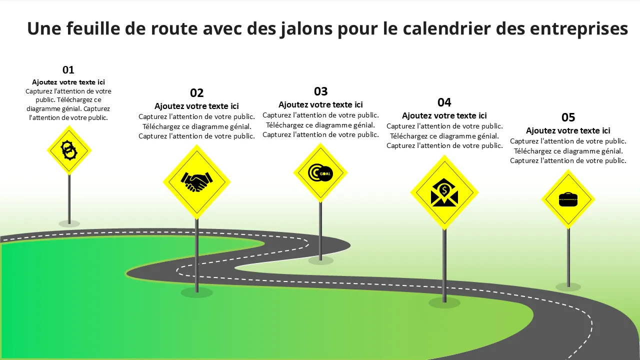 Feuille de route avec jalons pour la chronologie des affaires Modèle PowerPoint plat de conception PowerPoint pour les présentations professionnelles