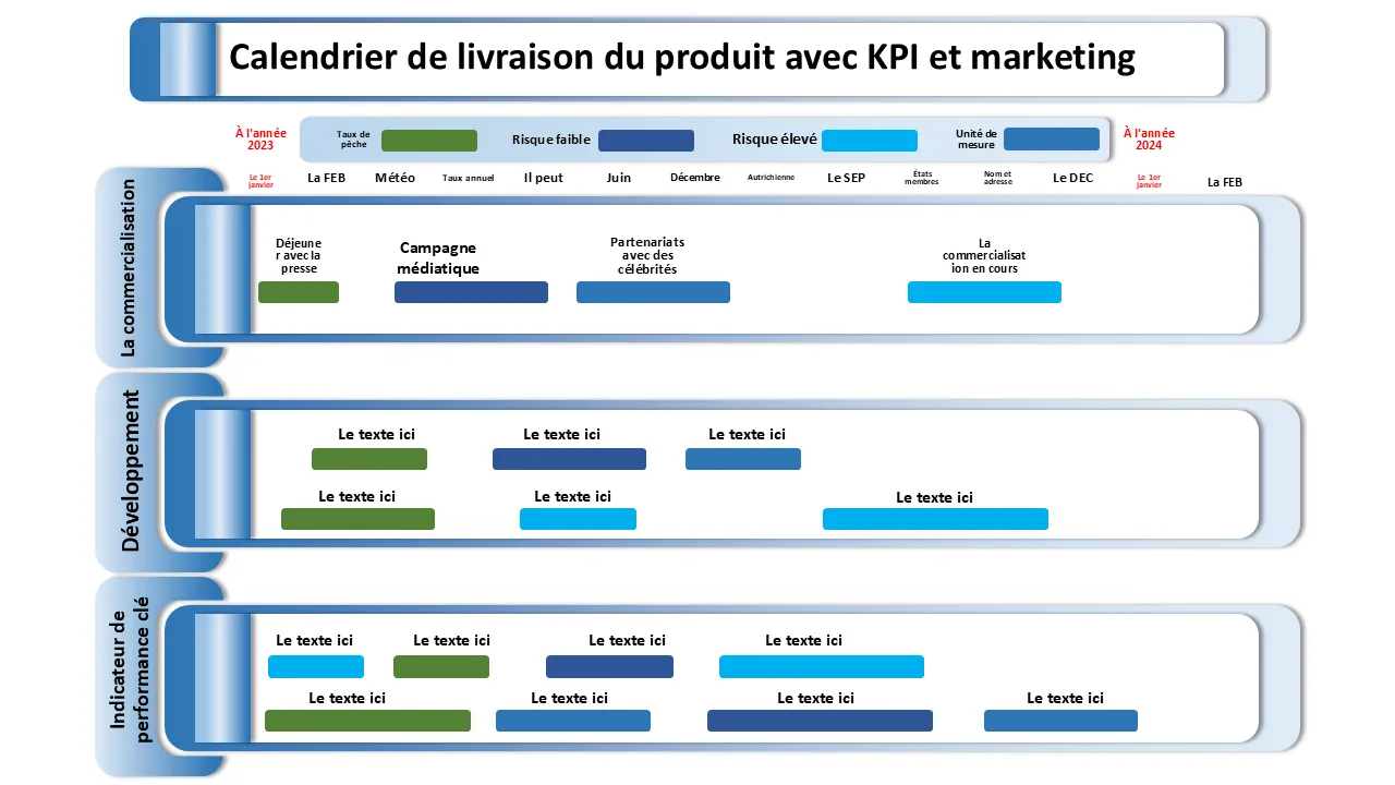 Un calendrier de livraison de produit dynamique avec Kpi et marketing conçu pour les chefs de produit et les équipes de développement. Idéal pour les stratégies de lancement, les feuilles de route de produits et la planification de la mise sur le marché. Modifiable et prêt pour la présentation.