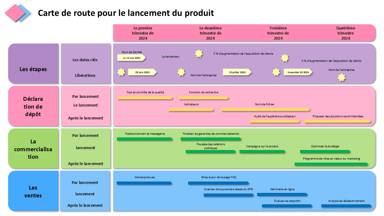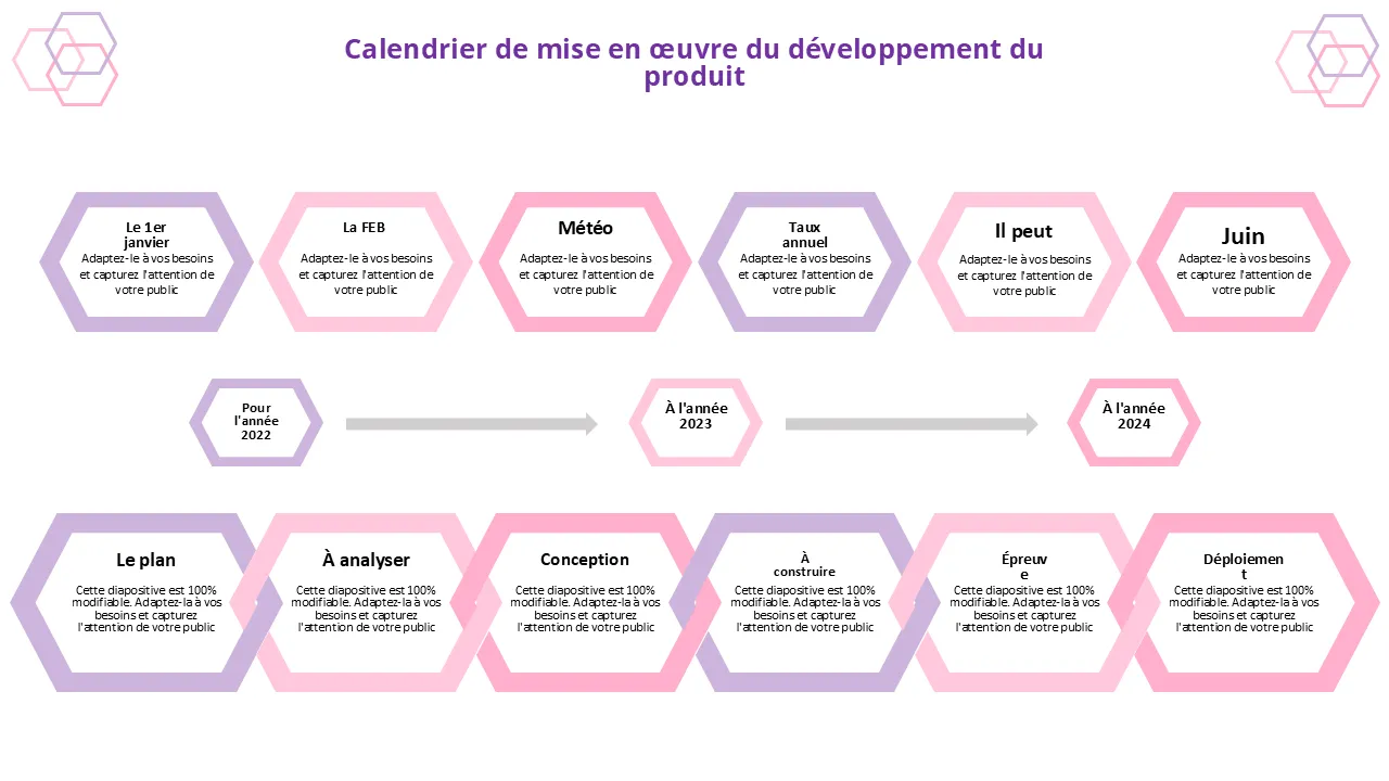 Une feuille de route produit dynamique Idées PowerPoint conçues pour les chefs de produit et les équipes de développement. Idéal pour les stratégies de lancement, les feuilles de route de produits et la planification de la mise sur le marché. Modifiable et prêt pour la présentation.