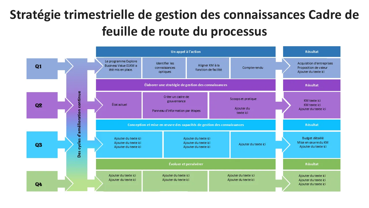 Modèle PowerPoint de cadre de feuille de route de processus de stratégie de gestion des connaissances trimestrielle pour les présentations professionnelles