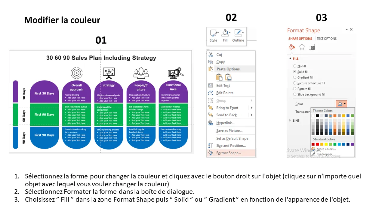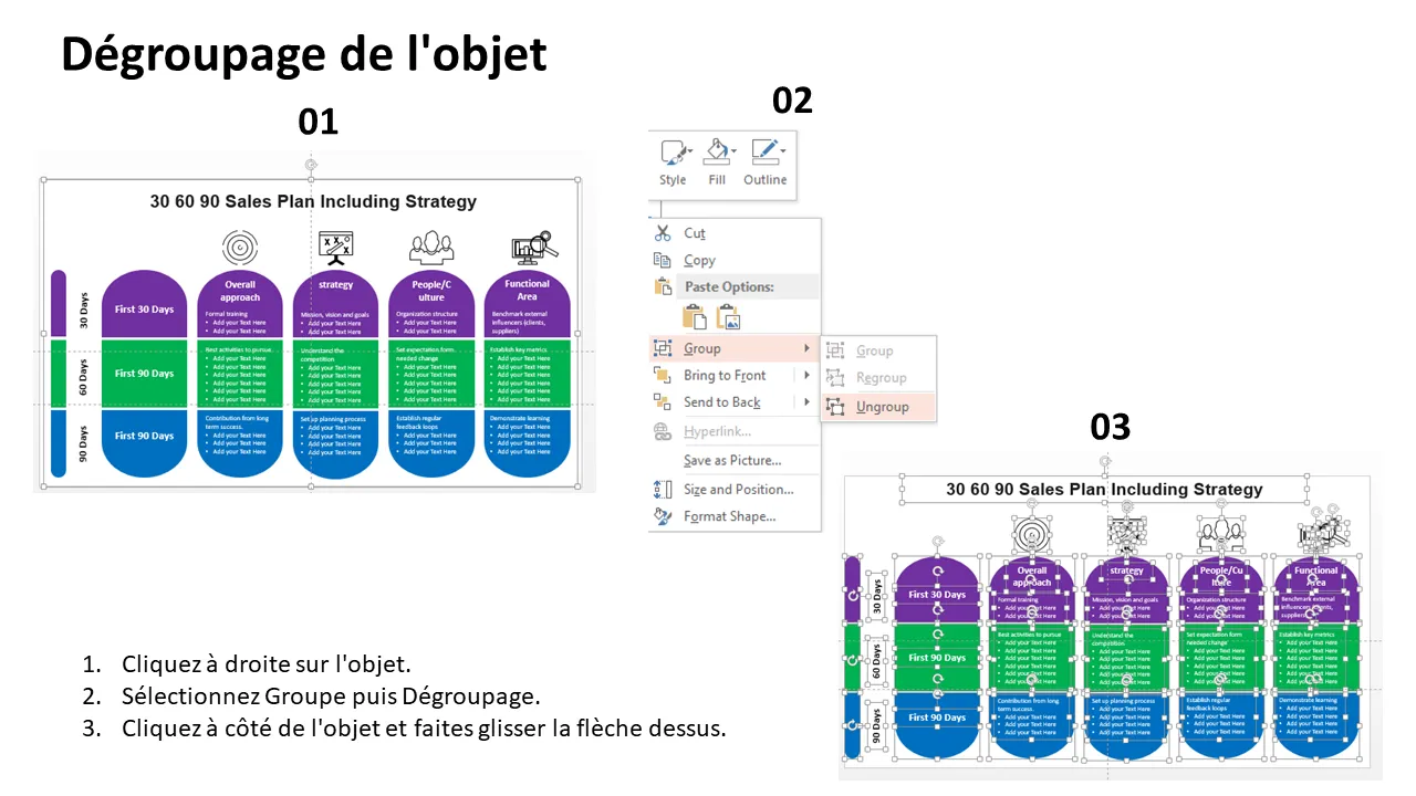- Trois sections de phases distinctes pour une planification sur 30, 60 et 90 jours