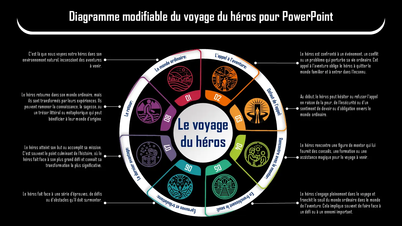 Diagramme modifiable du voyage du héros pour explication Powerpoint