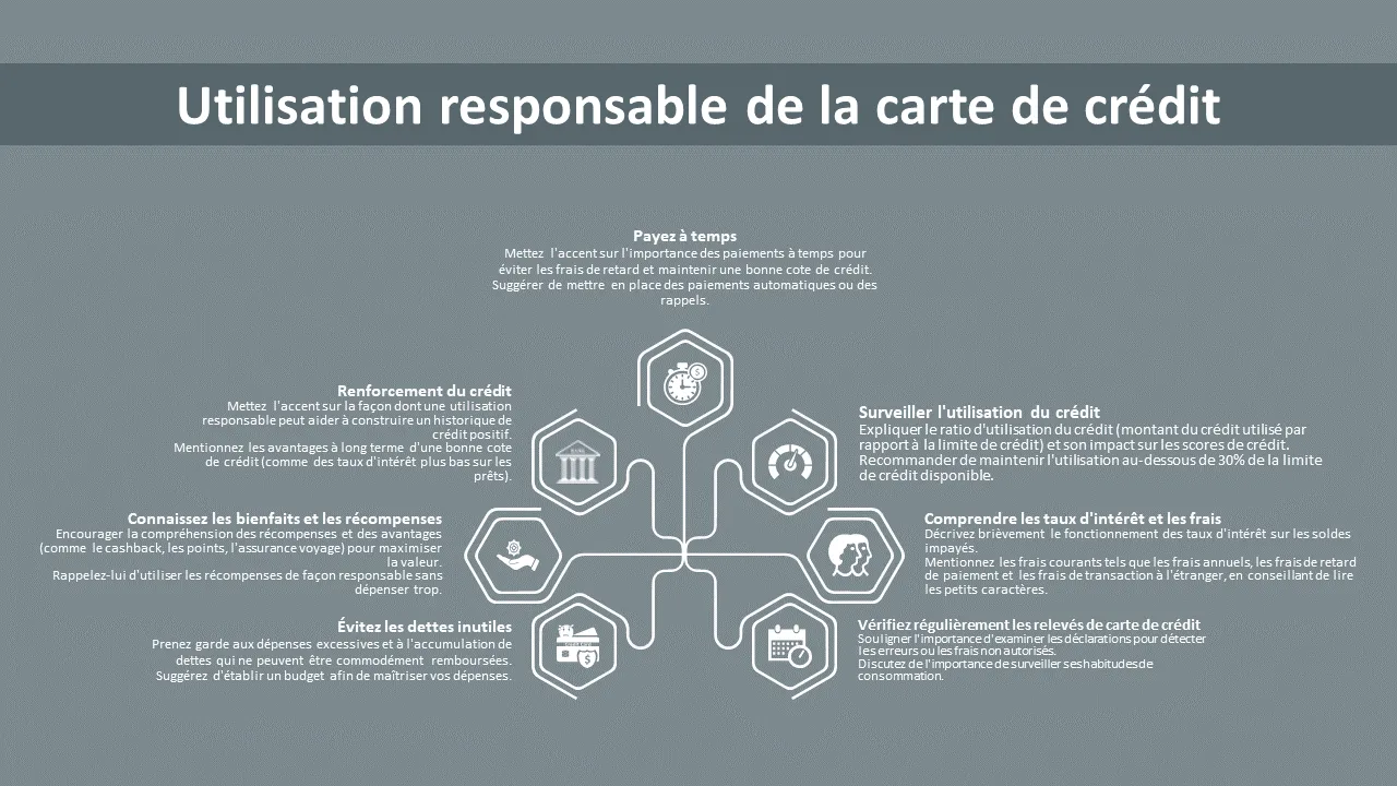 Les institutions financières, les émetteurs de cartes de crédit et les startups de technologie financière utilisent ce modèle pour éduquer les clients ou intégrer de nouveaux utilisateurs. Il est également parfait pour les sessions de formation internes, les présentations aux investisseurs ou les supports marketing expliquant les offres de cartes de crédit. Le modèle convient à des rôles tels que les conseillers financiers, les responsables du service client et les spécialistes du marketing de produits dans les secteurs de la banque, de la technologie financière et de la vente au détail.