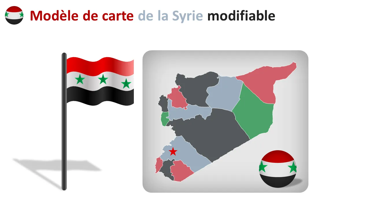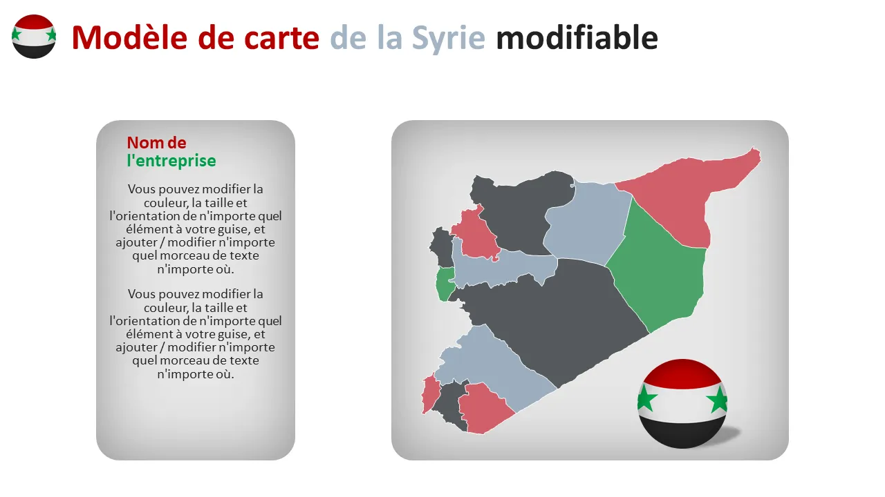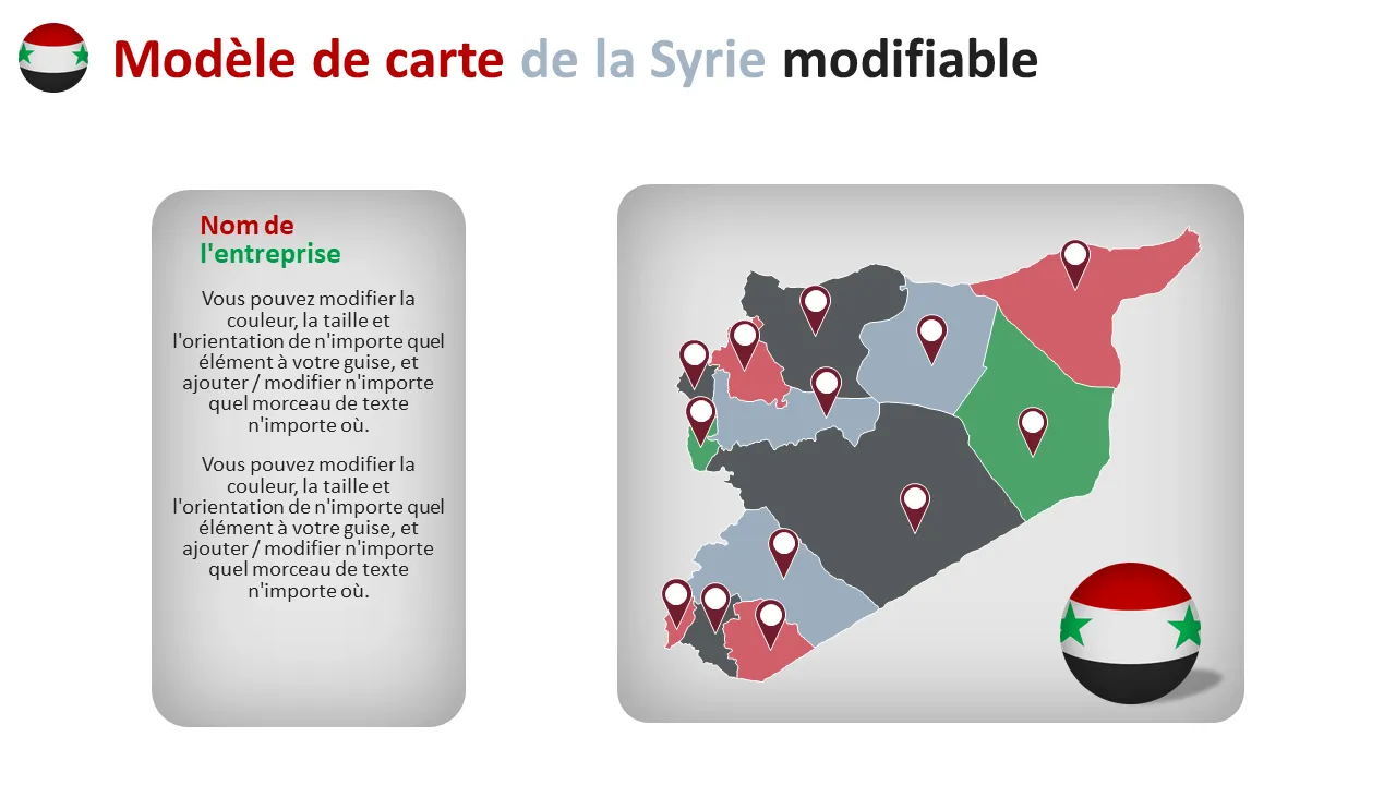 Les analystes commerciaux, les consultants et les stratèges régionaux utilisent ce modèle pour présenter les résultats d'études de marché, les cartes de segmentation des clients ou la logistique de la chaîne d'approvisionnement en Syrie. Il est particulièrement utile aux ONG, aux entreprises internationales et aux agences gouvernementales travaillant dans la région. Les dirigeants qui préparent des mises à jour pour les investisseurs ou des présentations de stratégie d'entreprise bénéficient de sa présentation épurée et de son esthétique professionnelle.