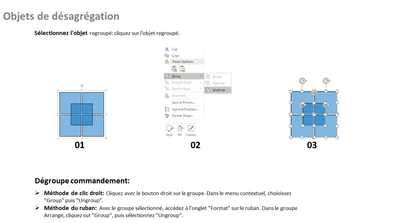 - Comprend des notes d'instructions pour regrouper les éléments sans perturber la conception