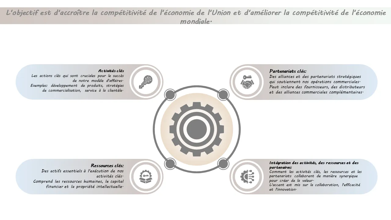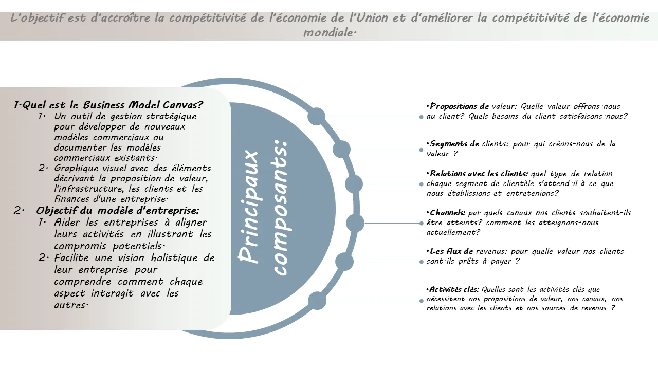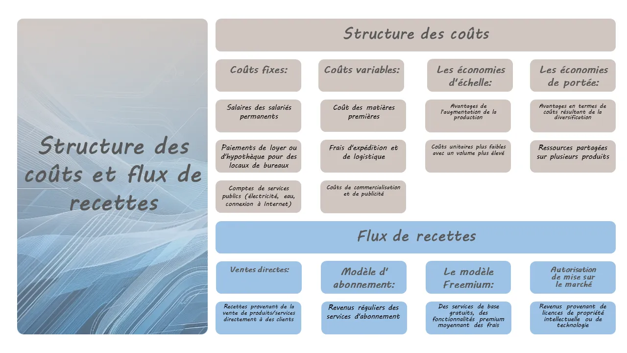 - Espaces réservés prêts à l'emploi pour les éléments clés du modèle commercial tels que la structure des coûts et les partenaires clés