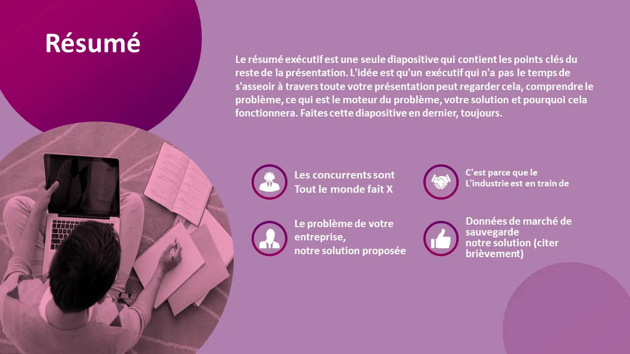 - Diapositive de résumé conçue pour une compréhension de dernière minute par les dirigeants occupés