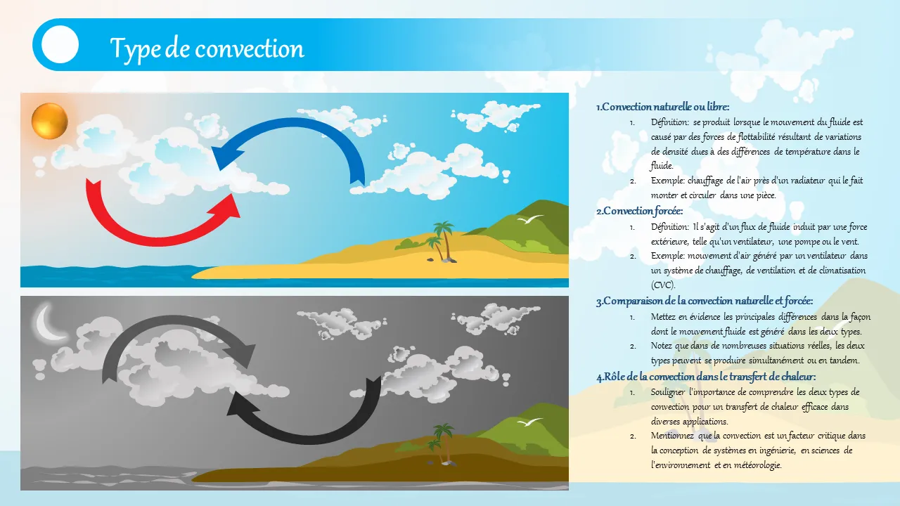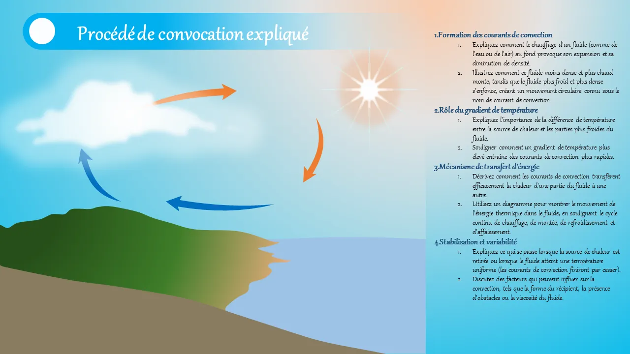 Les ingénieurs et les enseignants utilisent ce modèle pour expliquer les mécanismes de convection dans les salles de classe, les ateliers ou les sessions de formation en entreprise. Il est particulièrement utile dans des domaines tels que le génie mécanique, la conception CVC et les systèmes énergétiques. Les équipes techniques bénéficient de sa présentation structurée lors de la présentation de l'efficacité thermique, des modèles d'écoulement des fluides ou des systèmes d'échange de chaleur. Il prend également en charge les cours universitaires et les séminaires industriels où l'apprentissage visuel est essentiel.