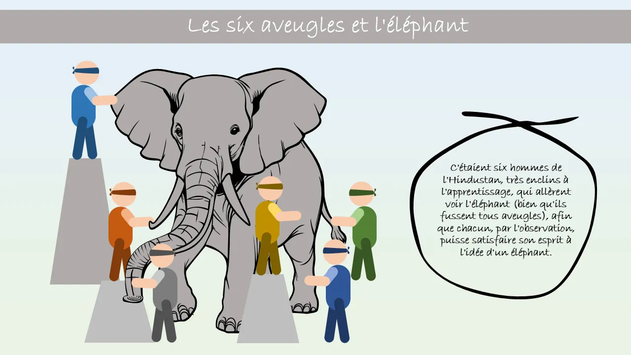 Explication de la métaphore des six aveugles et de l'éléphant