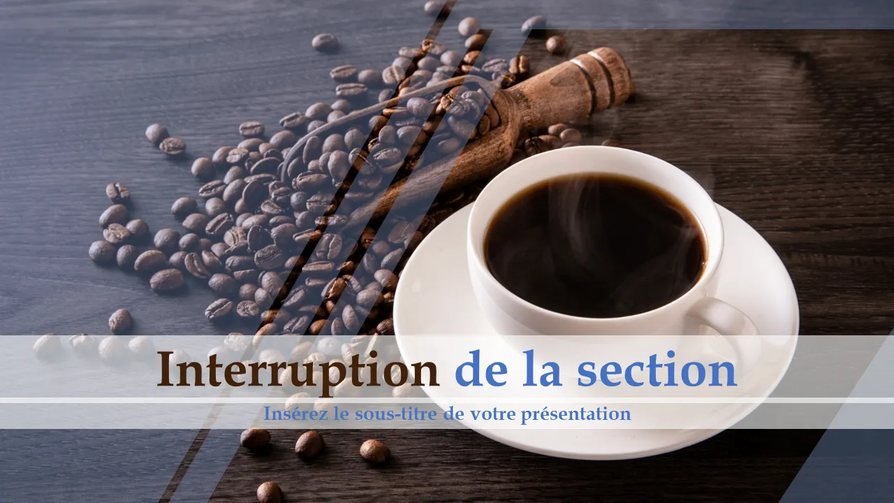 Ce modèle PowerPoint visuellement attrayant utilise les riches images de grains de café noirs pour symboliser la clarté, l'énergie et la concentration dans la planification stratégique de l'entreprise. Conçu pour les présentations qui exigent impact et professionnalisme, il combine une esthétique minimaliste avec des métaphores visuelles audacieuses pour transmettre des idées complexes. Parfait pour les présentations de dirigeants, les présentations d'investisseurs et les séances de stratégie d'entreprise, ce modèle aide les utilisateurs à communiquer leur vision avec confiance et précision.